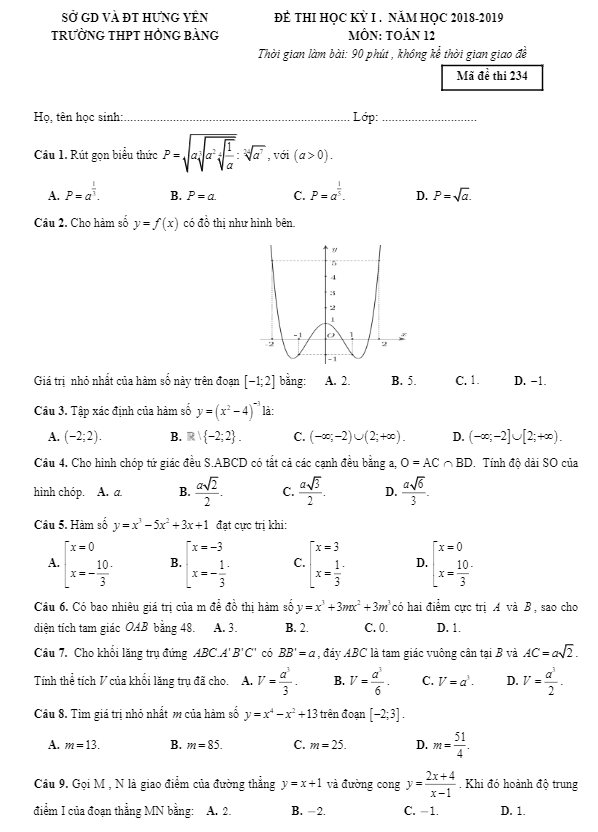 Đề thi học kì 1 (HK1) lớp 12 Toán trường THPT Hồng Bàng Hưng Yên