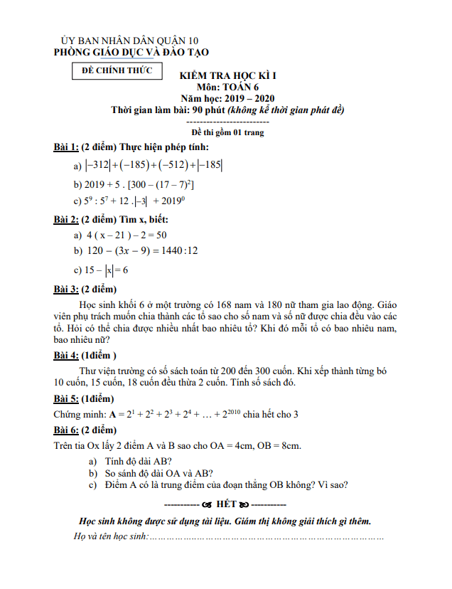 Xin chào quý thầy, cô giáo và các em học sinh lớp 6! Hôm nay, Sytu xin giới thiệu đến mọi người đề thi học kỳ 1 môn Toán cho lớp 6 năm học 2019 – 2020 của phòng GD&ĐT Quận 10, thành phố Hồ Chí Minh.