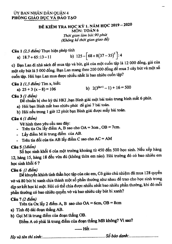Đề thi học kì 1 (HK1) lớp 6 môn Toán năm 2019 2020 phòng GD ĐT Quận 4 TP HCM