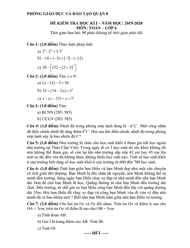 Trích đề thi học kỳ 1 Toán lớp 6 năm 2019 – 2020 phòng GD&ĐT Quận 8 – TP HCM: