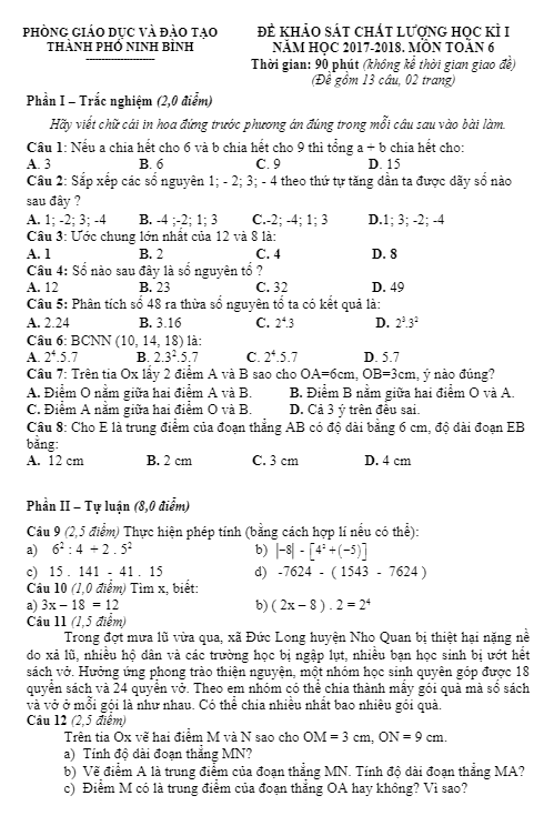 Đề thi học kỳ 1 Toán lớp 6 năm học 2017-2018 phòng GD và ĐT thành phố Ninh Bình
