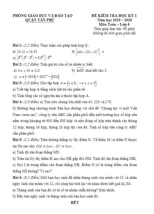 Để đảm bảo chất lượng học tập của học sinh khối lớp 6, vào cuối học kỳ 1 năm học 2019-2020, Phòng Giáo dục và Đào tạo Tân Phú, TP HCM đã tổ chức kỳ thi kiểm tra môn Toán cho lớp 6.