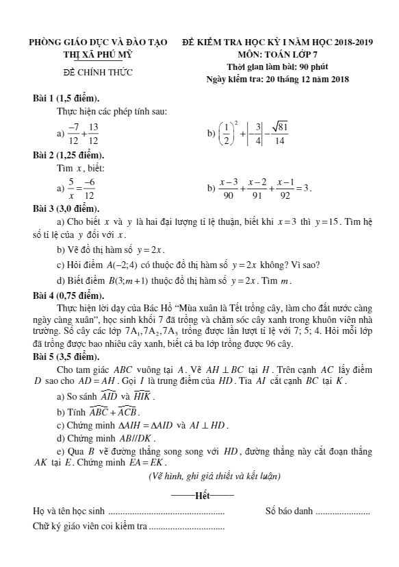 Đề thi học kì 1 (HK1) lớp 7 môn Toán năm 2018 – 2019 phòng GD ĐT Thị Xã Phú Mỹ – Bà Rịa – Vũng Tàu