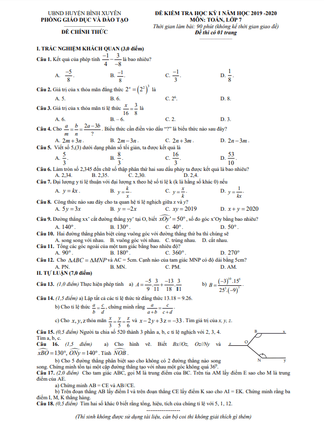 Đề thi học kỳ 1 Toán lớp 7 năm 2019 – 2020 phòng GD&ĐT Bình Xuyên – Vĩnh Phúc
