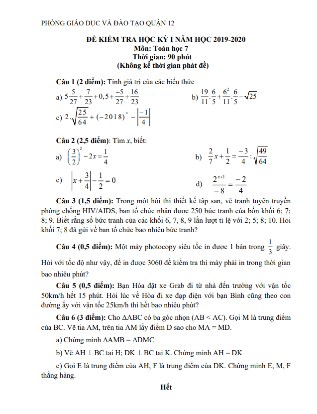 Trích dẫn đề thi học kỳ 1 Toán lớp 7 năm 2019 – 2020 phòng GD&ĐT Quận 12 – TP HCM: