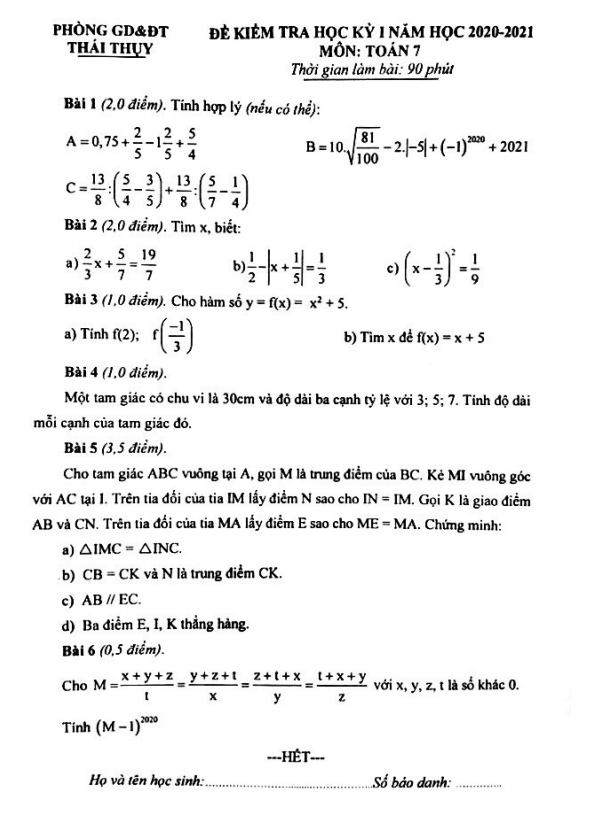 Đề thi học kì 1 (HK1) lớp 7 môn Toán năm 2020 2021 phòng GD ĐT Thái Thụy Thái Bình