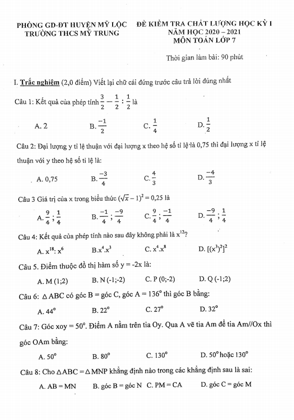 Đề thi học kỳ 1 Toán lớp 7 năm 2020 – 2021 trường THCS Mỹ Trung Nam Định