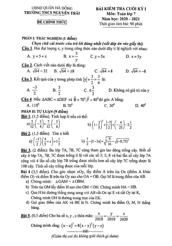 Đề thi học kỳ 1 môn Toán lớp 7 năm 2020-2021 của trường THCS Nguyễn Trãi Hà Nội được thiết kế theo tỉ lệ 10% trắc nghiệm và 90% tự luận. Bài thi bao gồm 4 câu trắc nghiệm và 5 câu tự luận, thời gian làm bài là 90 phút.