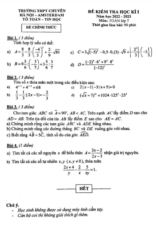 Đề thi học kì 1 (HK1) Toán lớp 7 năm 2022 – 2023 trường THPT chuyên Hà Nội Amsterdam