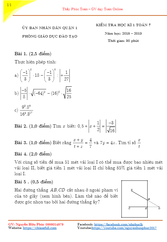 Đề thi học kì 1 (HK1) lớp 7 môn Toán năm học 2018 – 2019 của phòng GD ĐT Quận 1 TP. HCM là một bộ đề thi quan trọng đánh giá kiến thức và kỹ năng của học sinh. Đề thi được thiết kế để kiểm tra khả năng tiếp thu và áp dụng kiến thức Toán đã học trong suốt kỳ học đầu tiên của năm học.