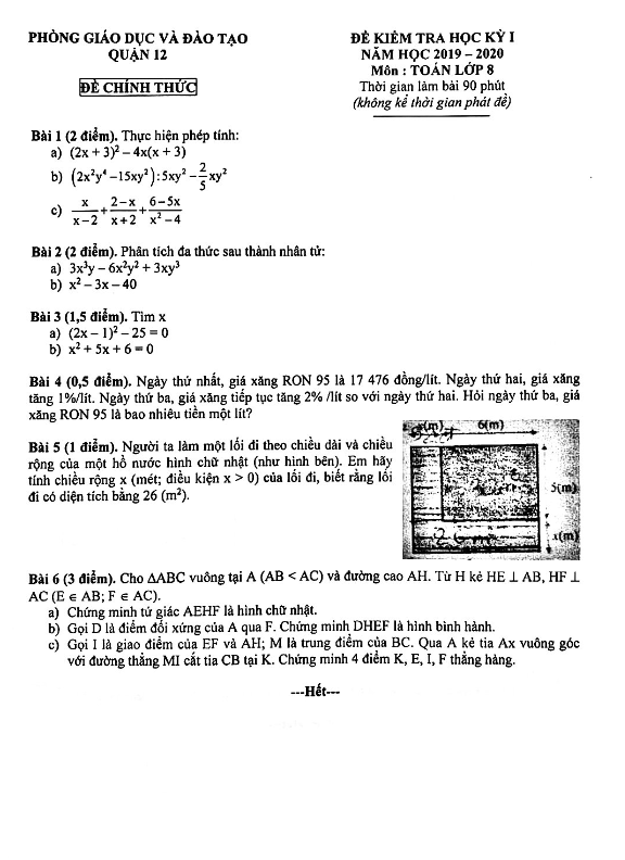Chào quý thầy cô và các em học sinh khối 8, dưới đây là đề thi học kỳ 1 môn Toán lớp 8 năm 2019 – 2020 của phòng Giáo dục và Đào tạo Quận 12, Thành phố Hồ Chí Minh.