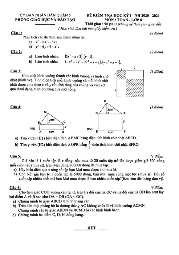 Đề thi học kì 1 môn Toán lớp 8 năm học 2020 – 2021 của phòng Giáo dục và Đào tạo Quận 5, thành phố Hồ Chí Minh bao gồm 01 trang với 06 bài toán dạng tự luận, thời gian làm bài 90 phút.