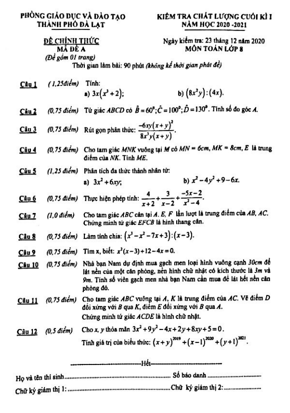 Đề thi học kì 1 (HK1) lớp 8 môn Toán năm 2020 2021 phòng GD ĐT TP Đà Lạt Lâm Đồng