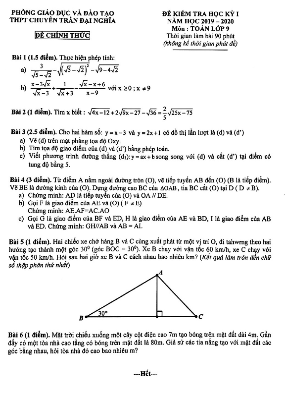 Đề thi học kỳ 1 (HK1) lớp 9 môn Toán năm 2019 2020 trường chuyên Trần Đại Nghĩa TP HCM