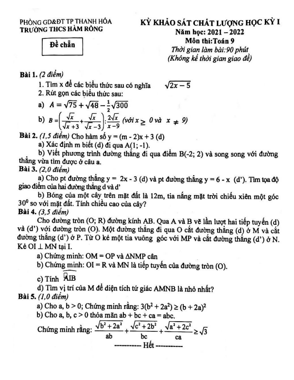 Đề thi học kỳ 1 Toán lớp 9 năm 2021 – 2022 trường THCS Hàm Rồng – Thanh Hóa
