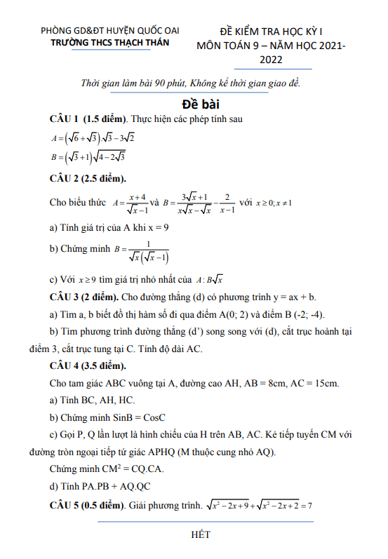 Đề thi học kỳ 1 Toán lớp 9 năm 2021 – 2022 trường THCS Thạch Thán – Hà Nội