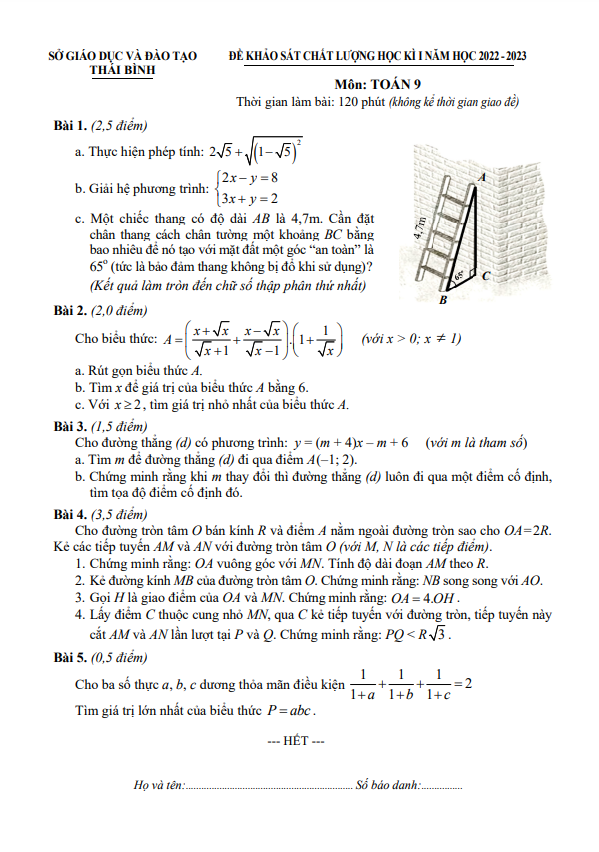 Đề thi học kì 1 (HK1) lớp 9 môn Toán năm 2022 2023 sở GD ĐT Thái Bình