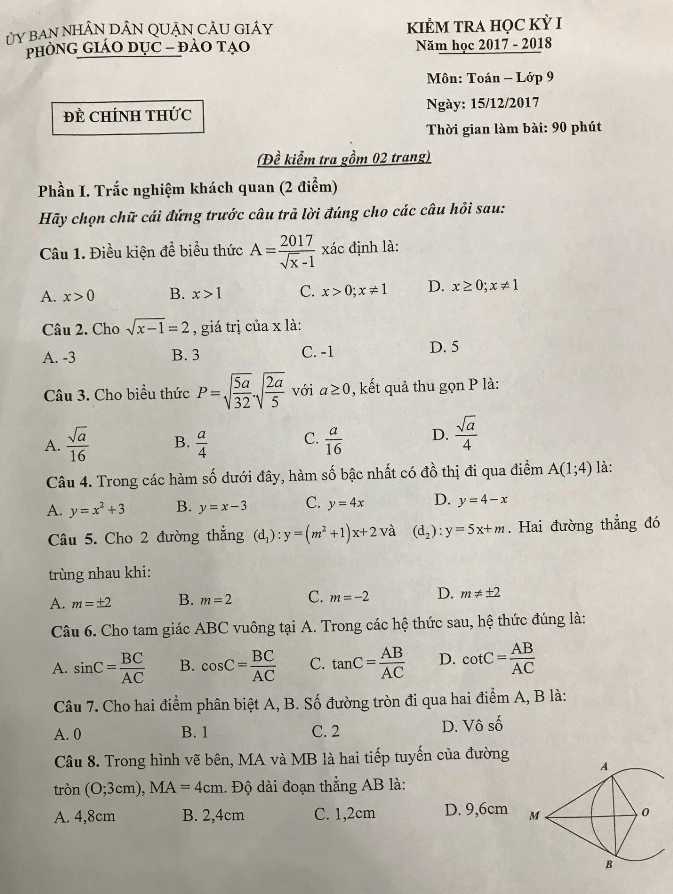 Đề thi học kì 1 Toán lớp 9 năm học 2017 – 2018 do phòng GD và ĐT Cầu Giấy Hà Nội ra là một bài thi quan trọng, gồm tổng cộng 12 câu hỏi chia thành 2 phần: