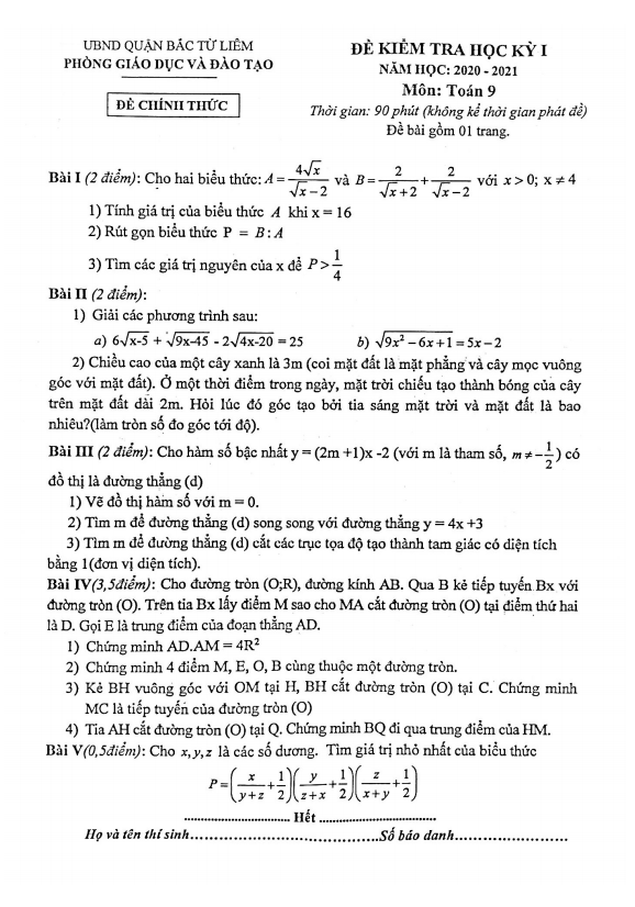 Đề thi học kì 1 môn Toán lớp 9 năm học 2020 – 2021 của phòng GD&ĐT Bắc Từ Liêm – Hà Nội bao gồm 5 bài toán dạng tự luận trên 1 trang. Thời gian làm bài thi là 90 phút. Dưới đây là một số câu hỏi từ đề thi: