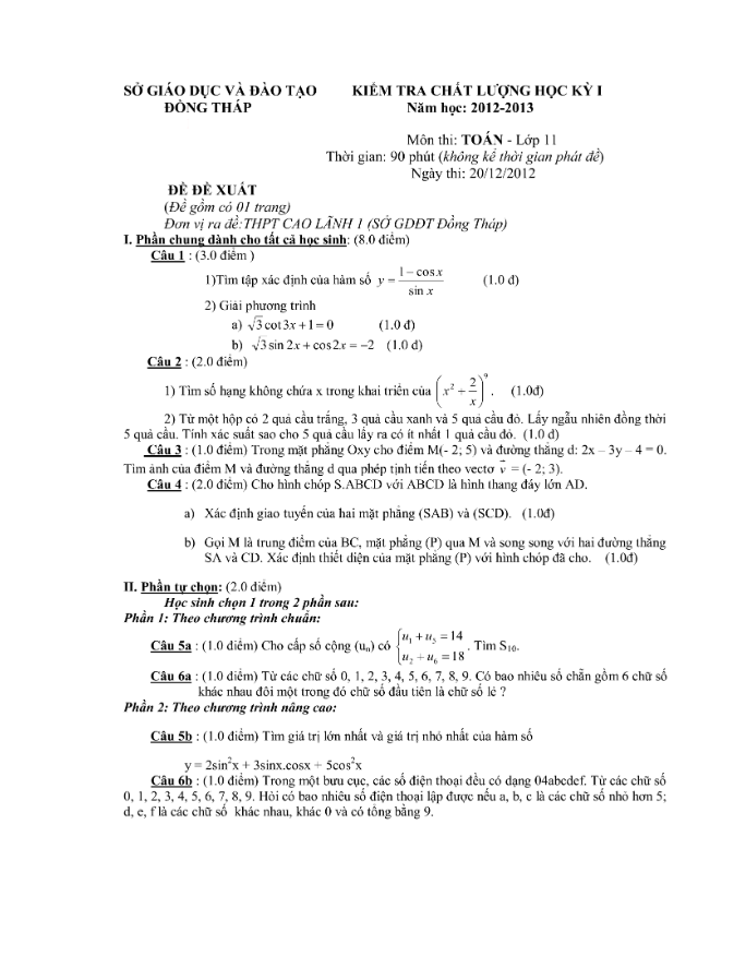 Đề thi Học kì 1 Lớp 11 Sở GD-ĐT Đồng Tháp năm học 2012 – 2013 là một đề thi có tính chất tham khảo và ôn tập cho học sinh lớp 11 trước khi bước vào kỳ thi học kì. Đề thi bao gồm các nội dung cơ bản trong chương trình như Phương trình lượng giác, Khai triển Newton, Bài toán xác suất chọn quả cầu, Hình học không gian và Dãy số. Đây là cơ hội để học sinh rèn luyện và kiểm tra kiến thức của mình.