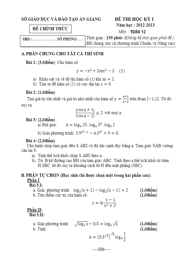 Đề thi học kì 1 (HK1) Sở GD và ĐT tỉnh An Giang 2012 2013: