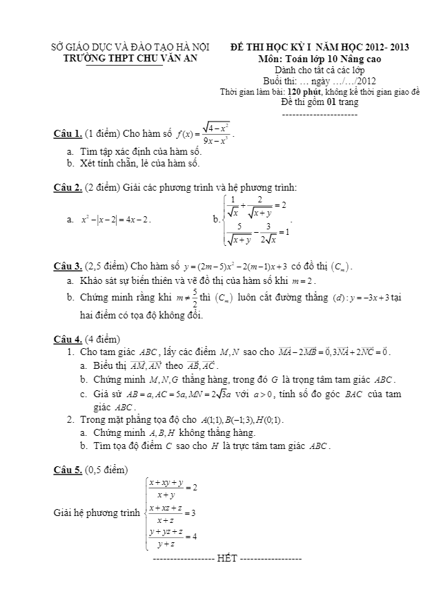 Đề thi Học kì 1 lớp 10 trường THPT Chu Văn An – Hà Nội năm học 2012 – 2013 bao gồm 5 câu tự luận với các dạng bài sau: