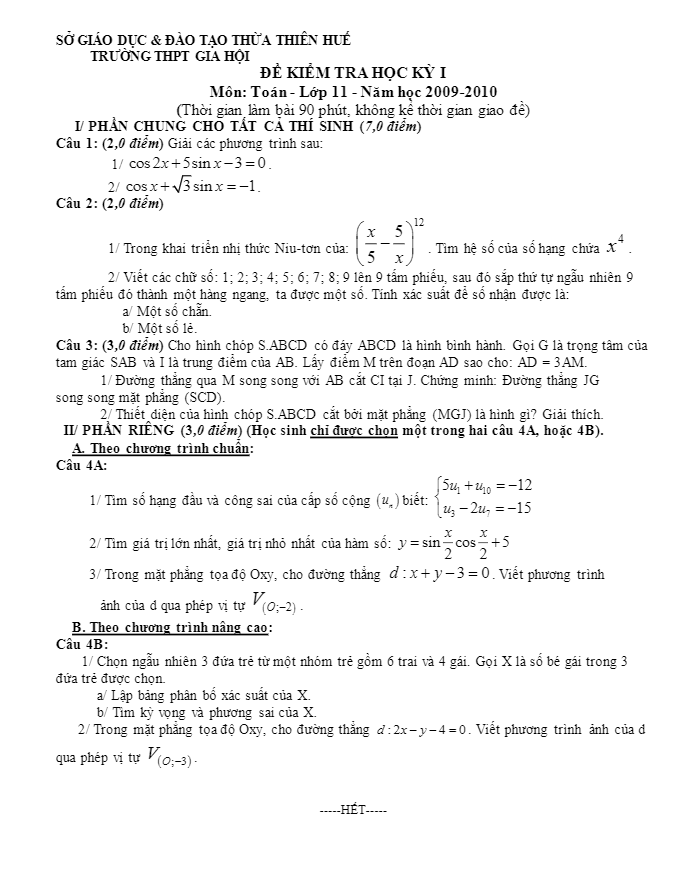 Đề thi học kì 1 lớp 11 trường THPT Gia Hội – Huế năm học 2009-2010 bao gồm 2 phần chính: Phần chung có 3 bài toán và phần riêng mỗi phần 1 bài toán. Đề thi cung cấp đáp án và thang điểm, giúp học sinh tự đánh giá và cải thiện kiến thức của mình.