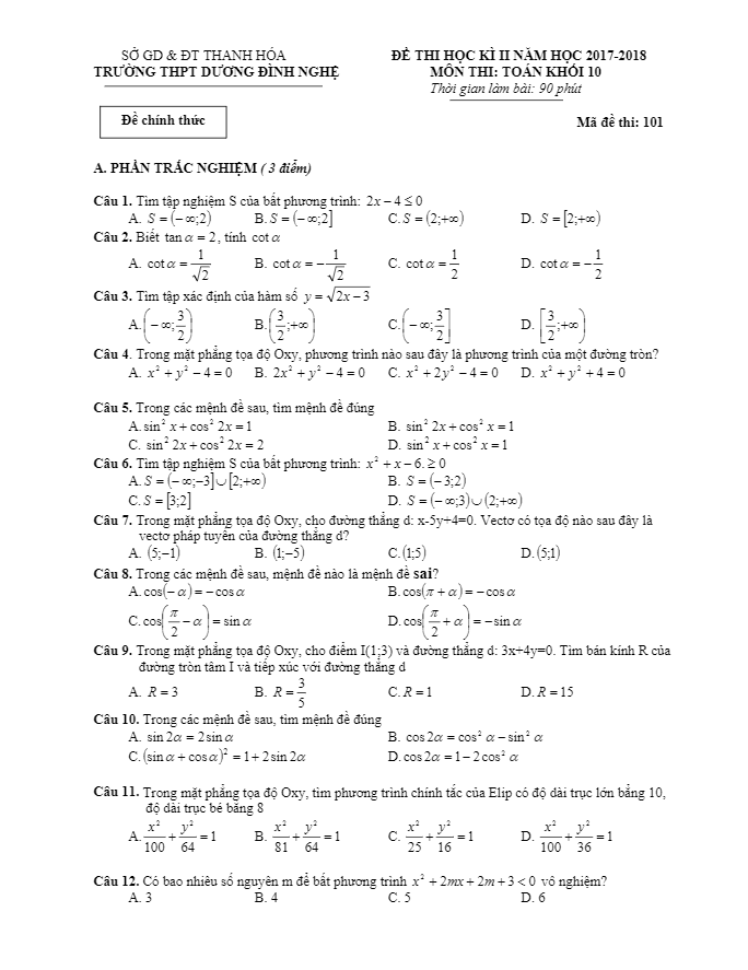 Đề thi học kỳ 2 Toán lớp 10 năm 2017-2018 trường THPT Dương Đình Nghệ – Thanh Hóa