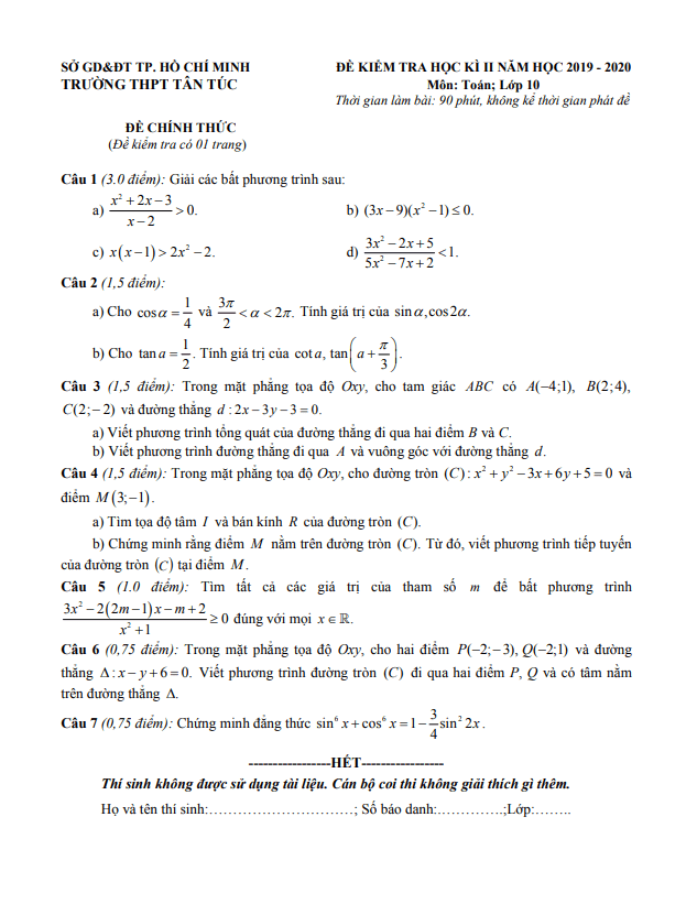 Giới Thiệu Đề Thi Học Kì 2 Toán Lớp 10 năm 2019-2020 Trường THPT Tân Túc TP HCM