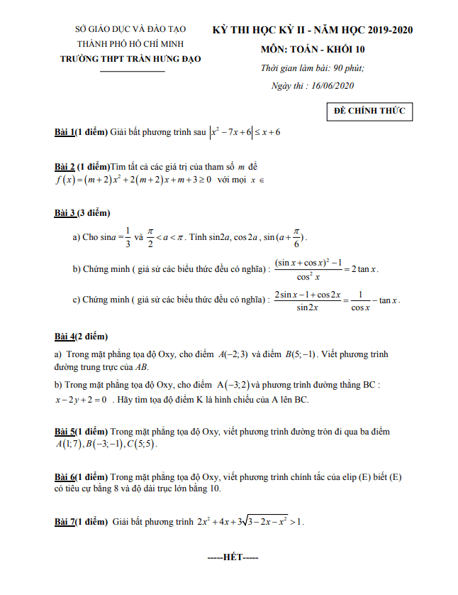 Đề thi học kì 2 (HK2) lớp 10 môn Toán năm 2019 2020 trường THPT Trần Hưng Đạo TP HCM