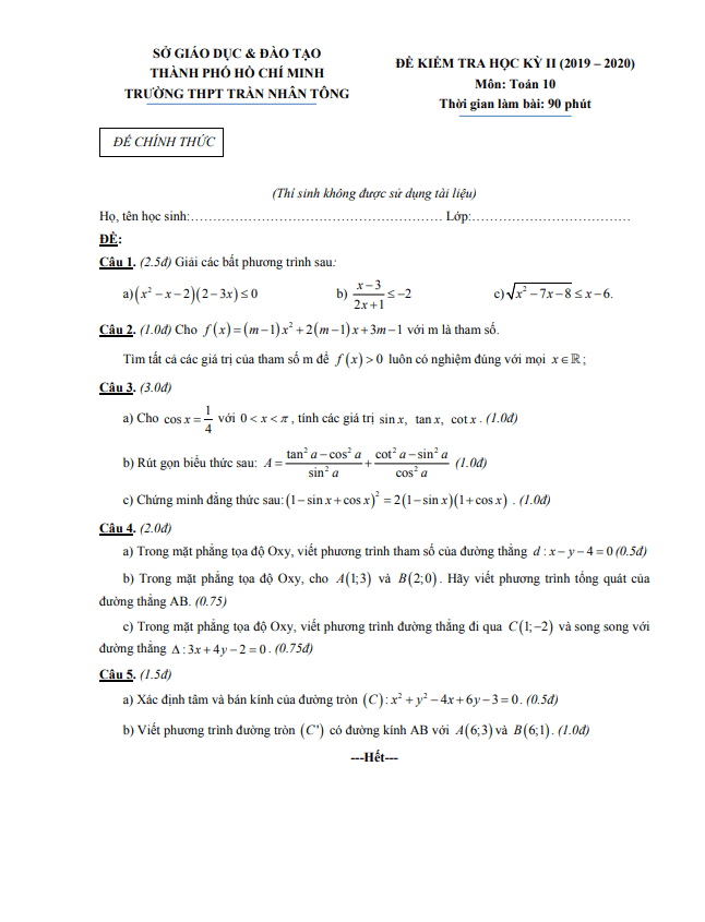 Đề thi học kì 2 (HK2) lớp 10 Toán năm 2019 – 2020 trường THPT Trần Nhân Tông TP HCM