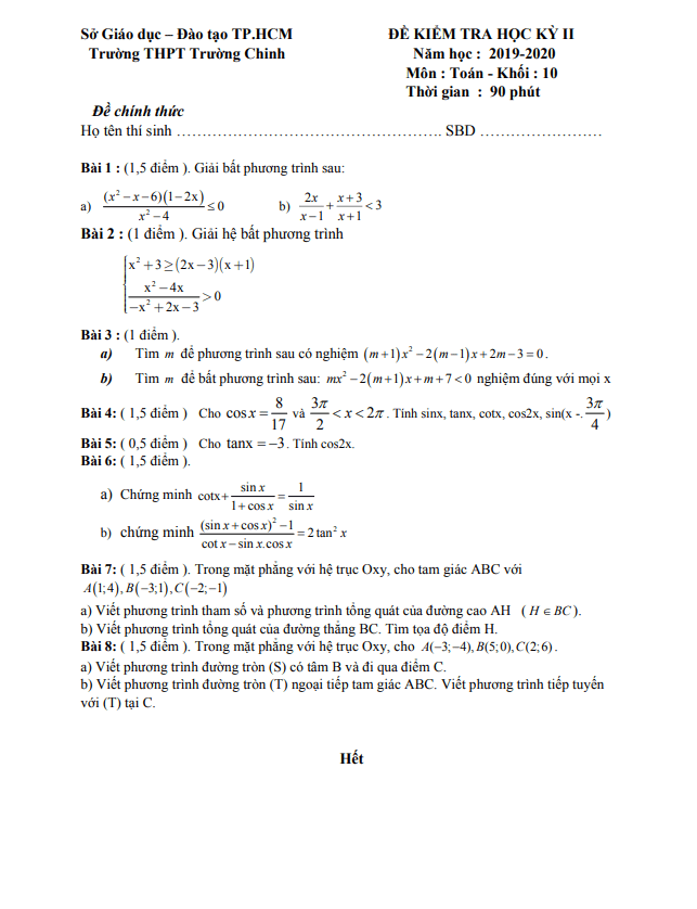Chúng ta sẽ cùng tìm hiểu về đề thi học kì 2 môn Toán lớp 10 năm học 2019 – 2020 của trường THPT Trường Chinh, thành phố Hồ Chí Minh. Đề thi này bao gồm các câu hỏi sau: