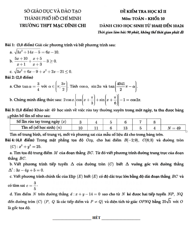 Đề thi Toán Học Kì 2 lớp 10 trường THPT Mạc Đĩnh Chi TP HCM