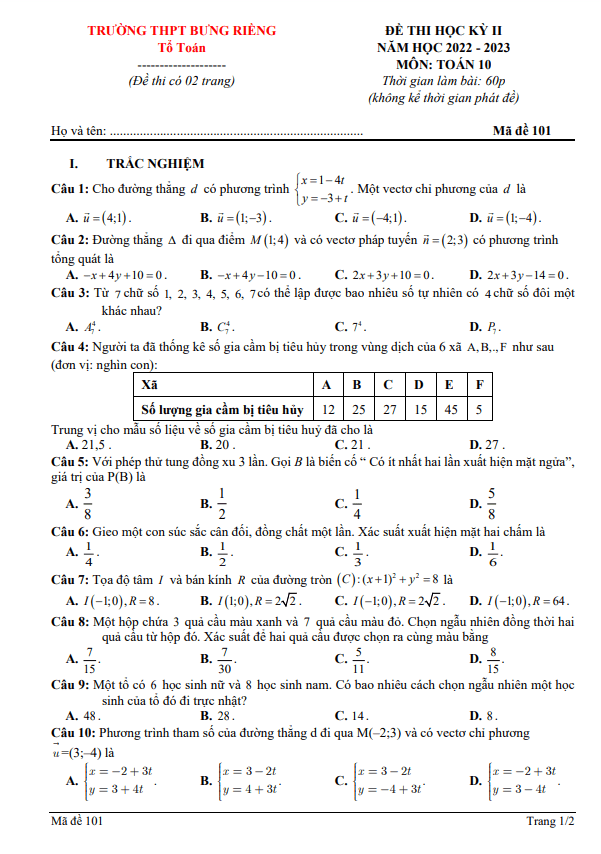 Xin chào quý thầy cô và các em học sinh lớp 10! Hôm nay, Sytu xin giới thiệu đến quý vị đề thi cuối học kỳ 2 môn Toán lớp 10 năm học 2022 – 2023 của trường THPT Bưng Riềng, tỉnh Bà Rịa – Vũng Tàu. Đề thi này bao gồm mã đề 101, 102, 103, 104 và đi kèm đáp án cùng hướng dẫn chấm điểm chi tiết.
