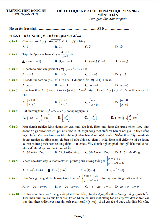 Syntu xin giới thiệu đến quý thầy cô và các em học sinh lớp 10 bộ đề thi cuối học kỳ 2 môn Toán năm học 2022-2023 của trường THPT Đồng Hỷ, Thái Nguyên. Đề thi bao gồm đáp án và thang điểm cho các em tham khảo.Đề thi bắt đầu bằng một bài toán về một doanh nghiệp kinh doanh xe gắn máy và chiến lược kinh doanh xe ga Vison. Doanh nghiệp đưa ra thông tin về giá mua vào và giá bán ra của xe, cũng như dự định giảm giá bán để tăng doanh số. Học sinh cần tính toán và xác định giá bán mới để thu được lợi nhuận lớn nhất.Tiếp theo là bài toán về tính chiều cao của ô thoáng trong một bản vẽ thiết kế. Học sinh cần phải biết tính diện tích và tính cao của hình elip để giải quyết bài toán này.Cuối cùng, đề thi đưa ra câu hỏi liên quan đến hai con tàu A và B chuyển động trên biển, yêu cầu học sinh xác định góc giữa đường thẳng đi qua vị trí của hai tàu và trục Ox khi tàu B đạt khoảng cách ngắn nhất với tàu A.Các bài toán trong đề thi đều khá thú vị và đa dạng, giúp học sinh phát triển kỹ năng giải quyet vấn đề và logic. Đề thi cũng giúp học sinh rèn luyện kỹ năng tính toán và logic, từ đó nâng cao hiểu biết và khả năng giải quyet vấn đề của họ. Chúc các em học sinh thành công trong kỳ thi sắp tới!
