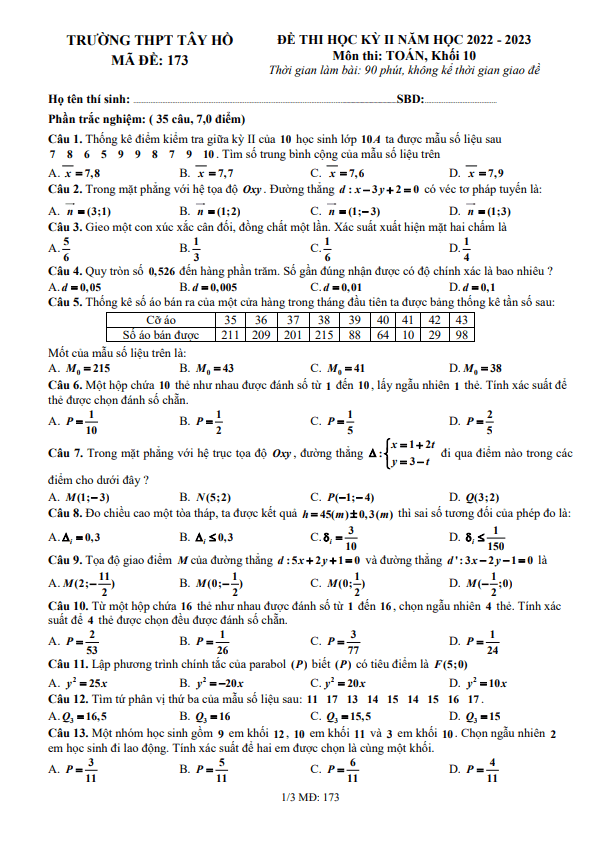 Chào các thầy cô và các em học sinh lớp 10! Hôm nay, mới nhận được đề thi cuối học kỳ 2 môn Toán của trường THPT Tây Hồ, thành phố Hà Nội. Cùng nhau điểm qua một số bài tập trong đề thi để hiểu rõ hơn về nội dung và cách giải quyết các câu hỏi.