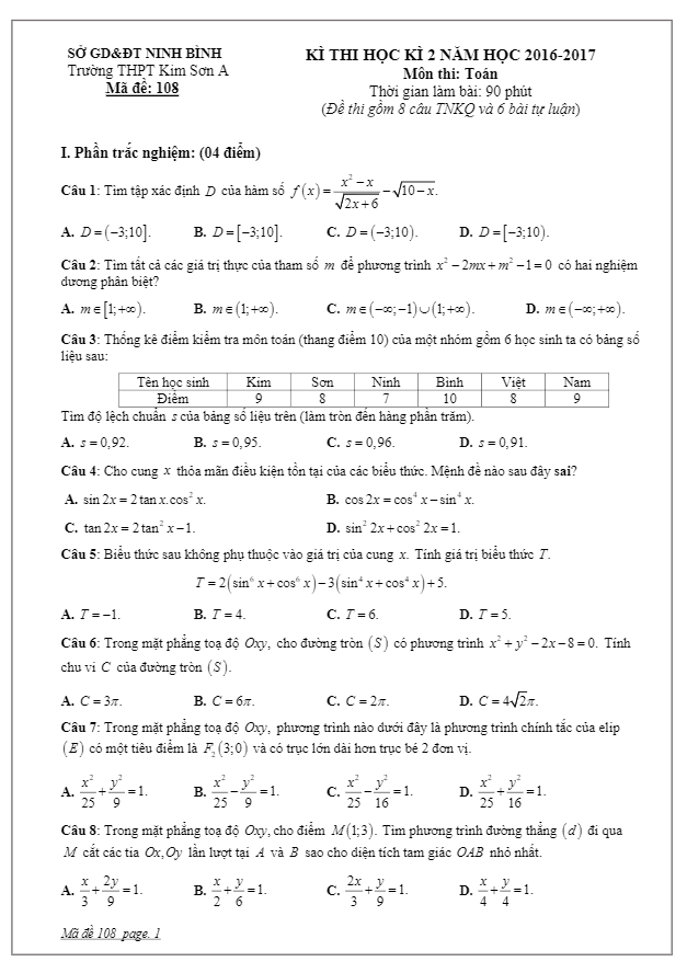 Đề thi học kỳ II môn Toán lớp 10 năm học 2016 – 2017 trường THPT Kim Sơn A Ninh Bình bao gồm 8 câu hỏi trắc nghiệm và 6 bài toán tự luận. Đề thi có đáp án và lời giải chi tiết giúp học sinh ôn tập và kiểm tra kiến thức.