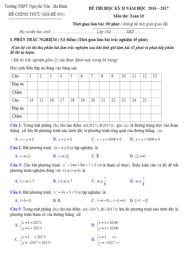 Đề thi học kì 2 (HK2) lớp 10 Toán năm học 2016-2017 trường THPT Nguyễn Trãi Hà Nội