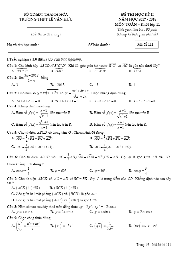 Đề thi học kì 2 Toán lớp 11 năm 2017 – 2018 trường THPT Lê Văn Hưu – Thanh Hóa