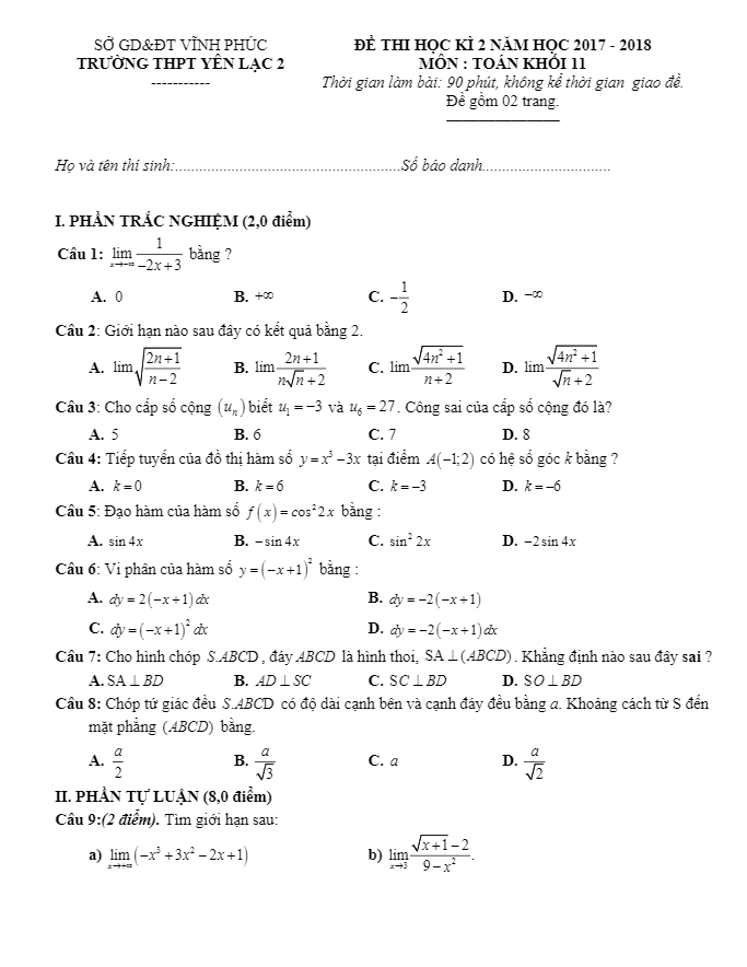 Đề thi học kỳ 2 Toán lớp 11 năm 2017-2018 trường THPT Yên Lạc 2 Vĩnh Phúc mang đến cho học sinh cơ hội để thực hành và kiểm tra kiến thức của mình trong môn Toán. Đề thi được thiết kế để khuyến khích sự tự tin, logic tư duy và khả năng giải quyết vấn đề cho học sinh.