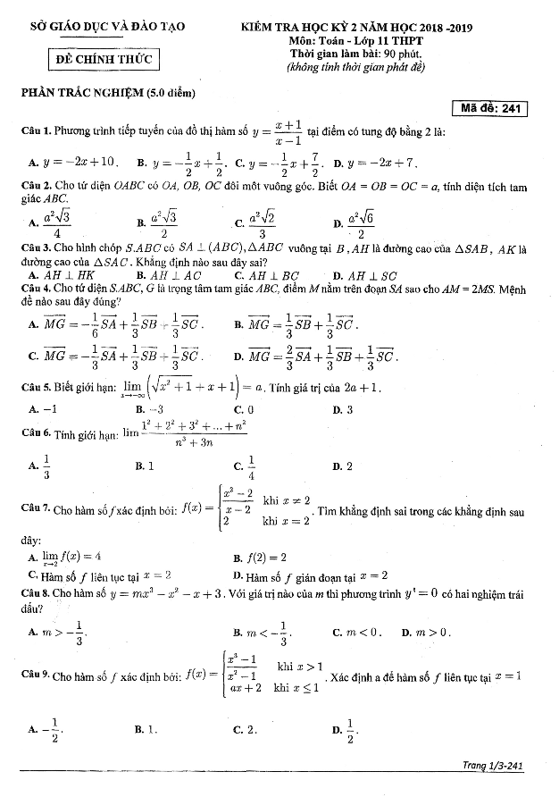 Ngày 03 tháng 05 năm 2019, sở Giáo dục và Đào tạo tỉnh Bình Dương đã tổ chức kỳ thi kiểm tra chất lượng môn Toán khối 11 hệ THPT cuối học kỳ 2 năm học 2018-2019. Đề thi học kỳ 2 Toán lớp 11 năm 2018-2019 sở GD&ĐT Bình Dương có mã đề 241, được biên soạn theo dạng đề kết hợp giữa trắc nghiệm khách quan và tự luận.