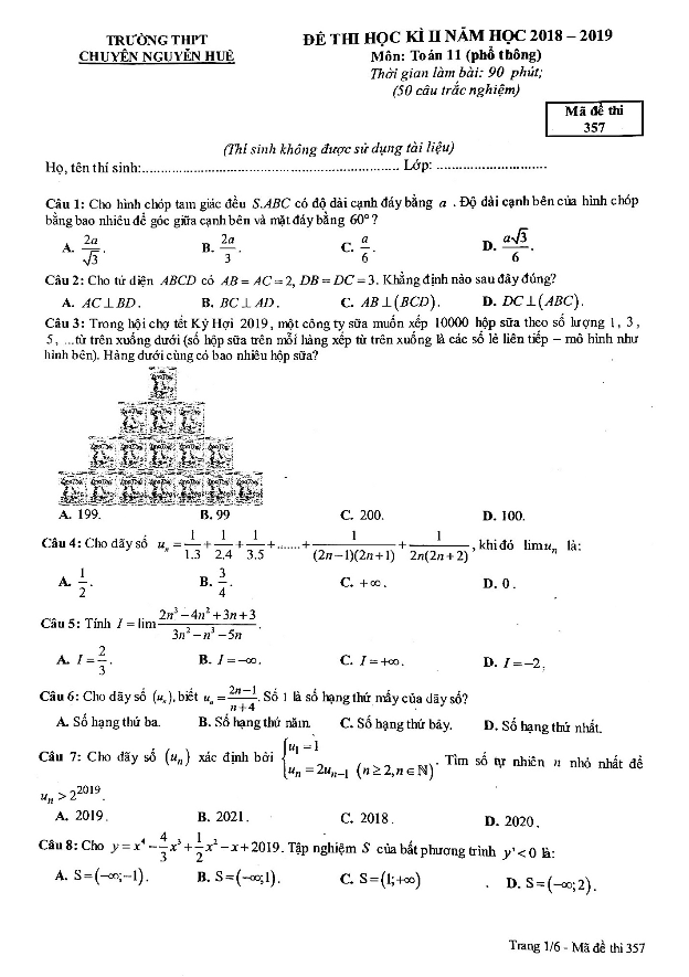 Đề thi học kì 2 Toán lớp 11 năm 2018 – 2019 của trường chuyên Nguyễn Huệ – Hà Nội có mã đề 357, được biên soạn dưới dạng đề 100% trắc nghiệm để phản ánh hướng thi trắc nghiệm hiện nay. Đề thi bao gồm 6 trang với tổng cộng 50 câu hỏi và bài toán, học sinh có 90 phút để hoàn thành bài thi mà không tính thời gian giao đề của giám thị.