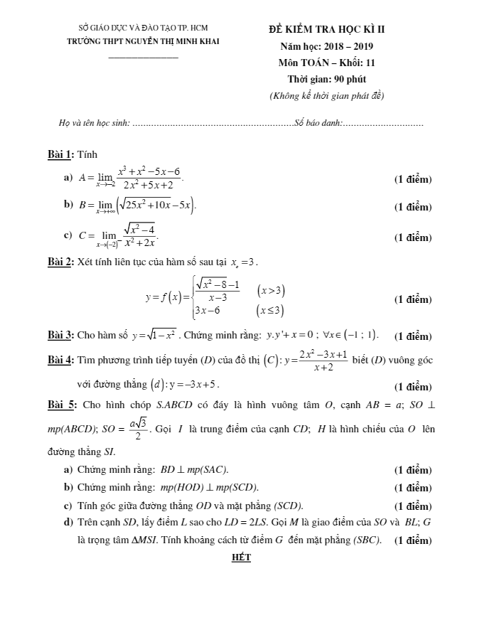 Đề thi học kì 2 Toán lớp 11 năm 2018 – 2019 trường Nguyễn Thị Minh Khai – TP HCM