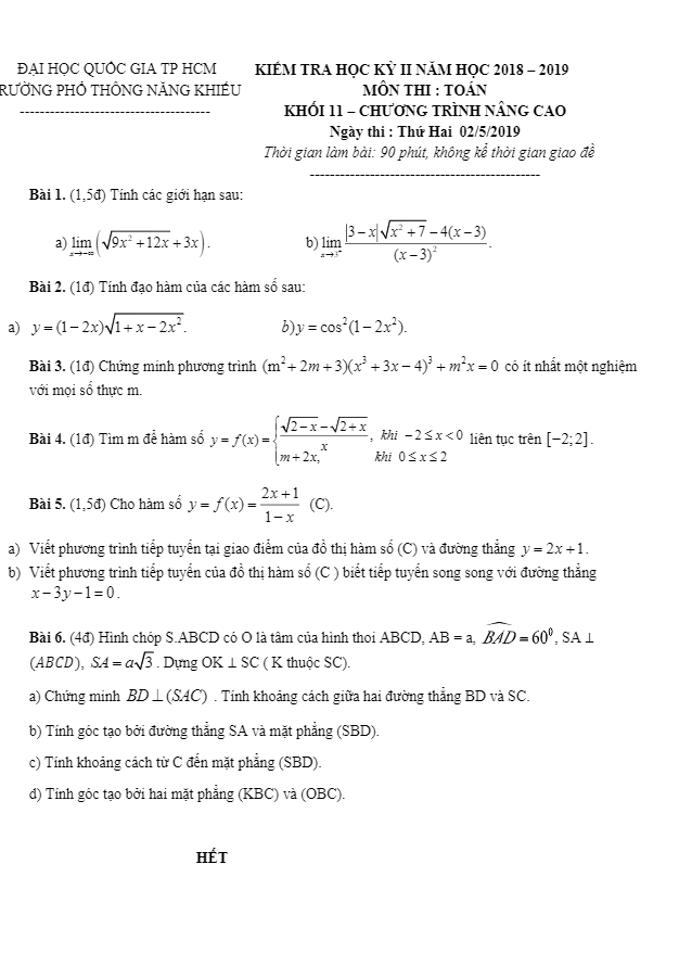 Đề thi học kì 2 (HK2) lớp 11 Toán năm 2018 2019 trường Phổ thông Năng khiếu TP HCM
