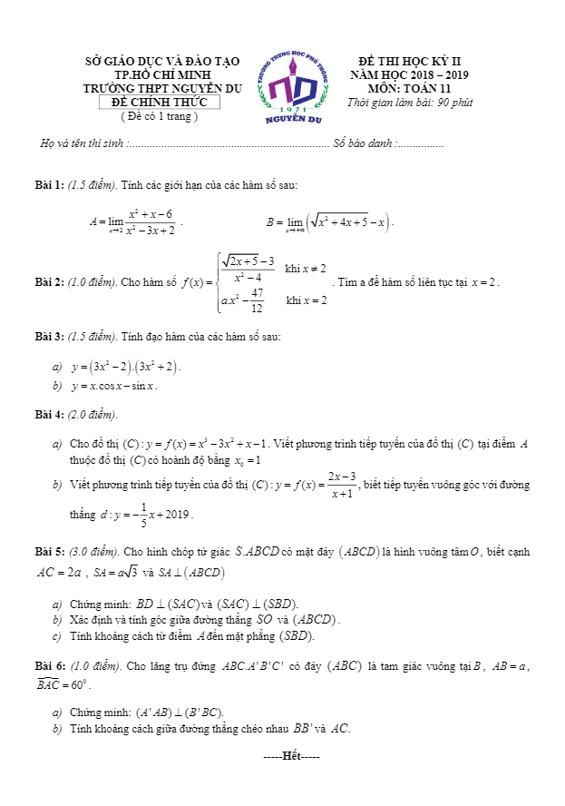 Đề thi học kì 2 Toán lớp 11 năm 2018 – 2019 trường THPT Nguyễn Du – TP HCM