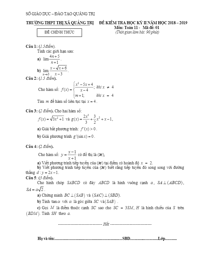 Đề thi học kì 2 Toán lớp 11 năm 2018 – 2019 trường THPT Thị xã Quảng Trị