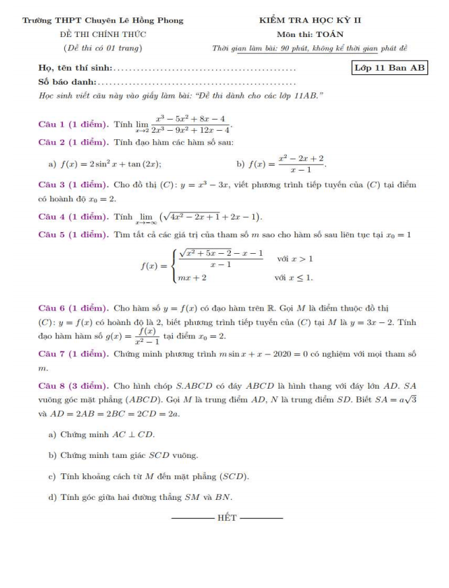 Đề thi học kì 2 (HK2) lớp 11 Toán năm 2019-2020 trường chuyên Lê Hồng Phong TP HCM