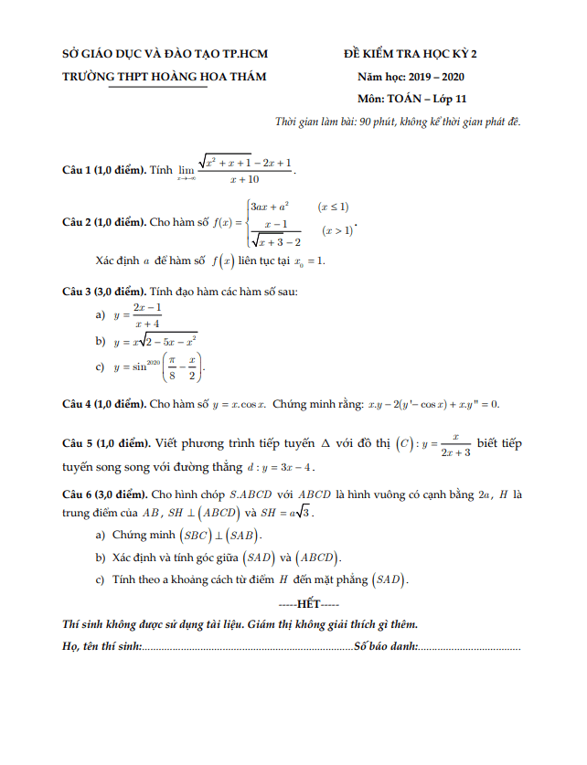 Đề thi học kì 2 (HK2) lớp 11 Toán năm 2019-2020 trường THPT Hoàng Hoa Thám TP HCM