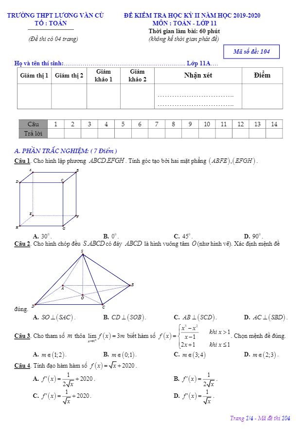 Đề thi học kỳ 2 Toán lớp 11 năm 2019 – 2020 trường THPT Lương Văn Cù – An Giang