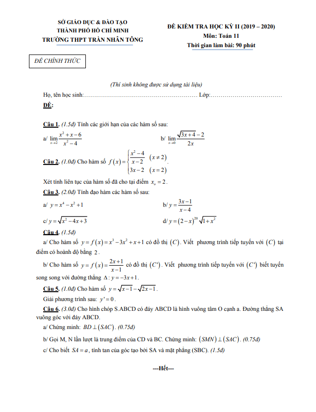Sytu xin gửi đến quý thầy, cô giáo và các em học sinh lớp 11 đề thi học kì 2 Toán lớp 11 năm học 2019 – 2020 của trường THPT Trần Nhân Tông, thành phố Hồ Chí Minh. Đề thi này được biên soạn kỹ lưỡng, bám sát chương trình học, và đi kèm với đáp án/ lời giải chi tiết giúp các em tự kiểm tra và ôn tập kiến thức một cách hiệu quả.